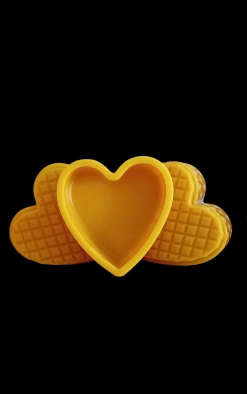 This handmade heart-shaped beeswax jar with lid is crafted from 100% natural beeswax. The jar is hand-poured into a silicone mold, creating a sturdy container with a decorative geometric texture.