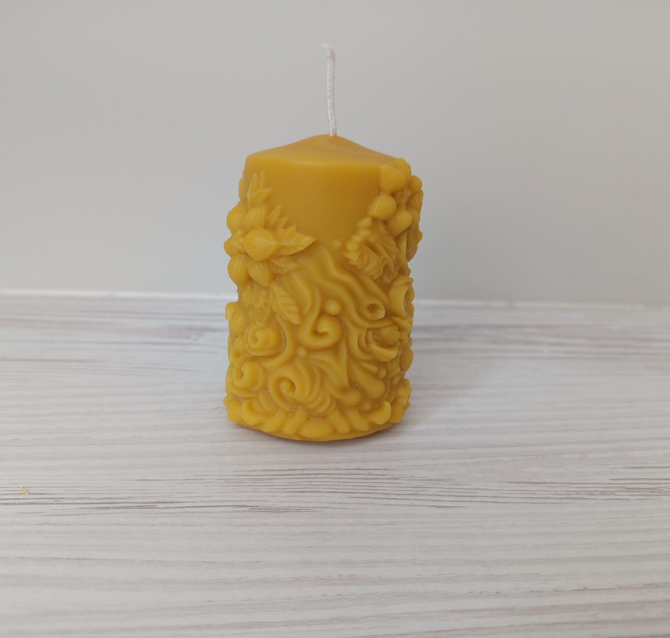 This handmade floral candle is crafted from 100% natural beeswax and finished with a cotton wick. The candle is hand-poured into a detailed silicone mold, creating a richly textured floral design with an elegant, timeless look.