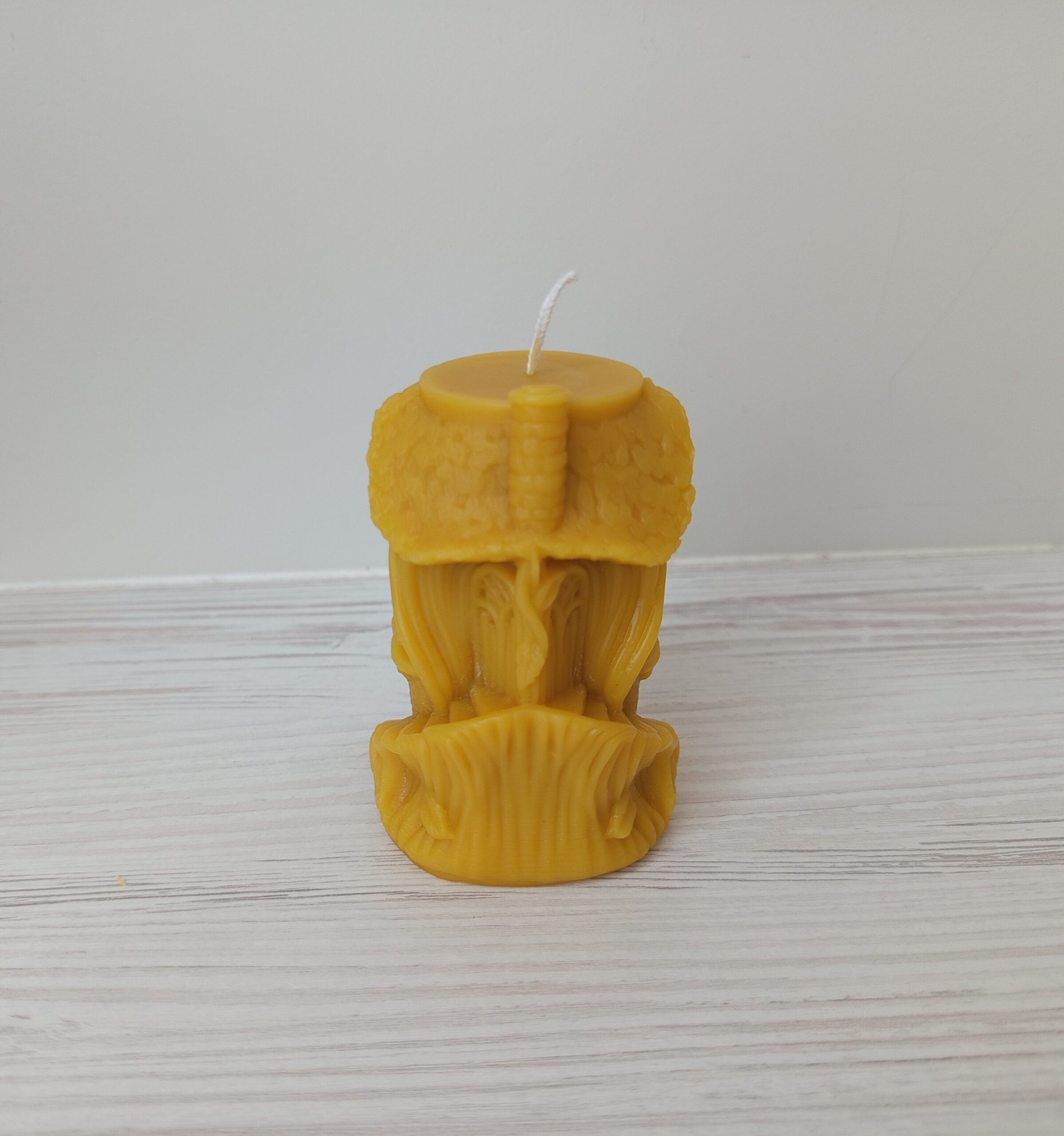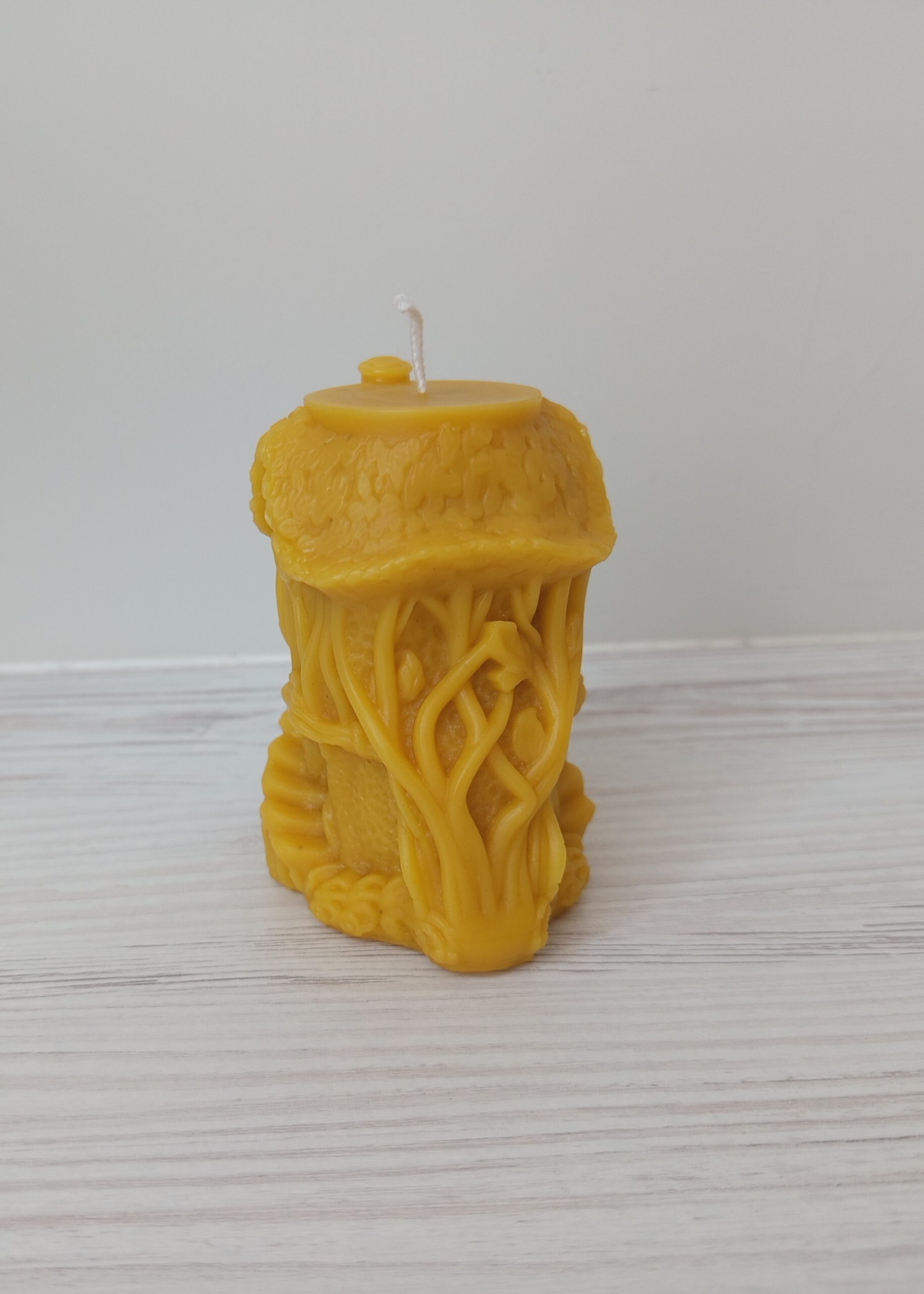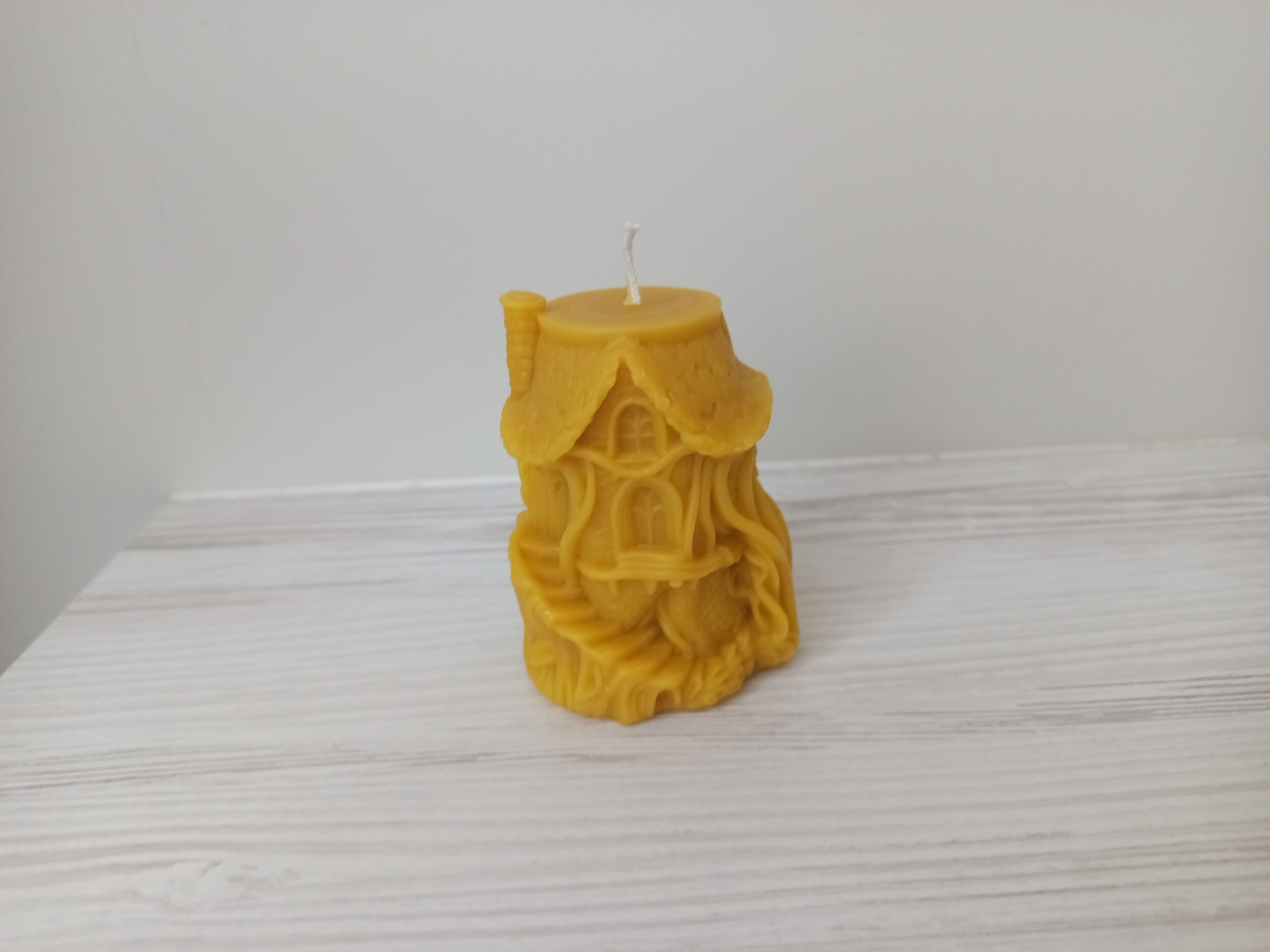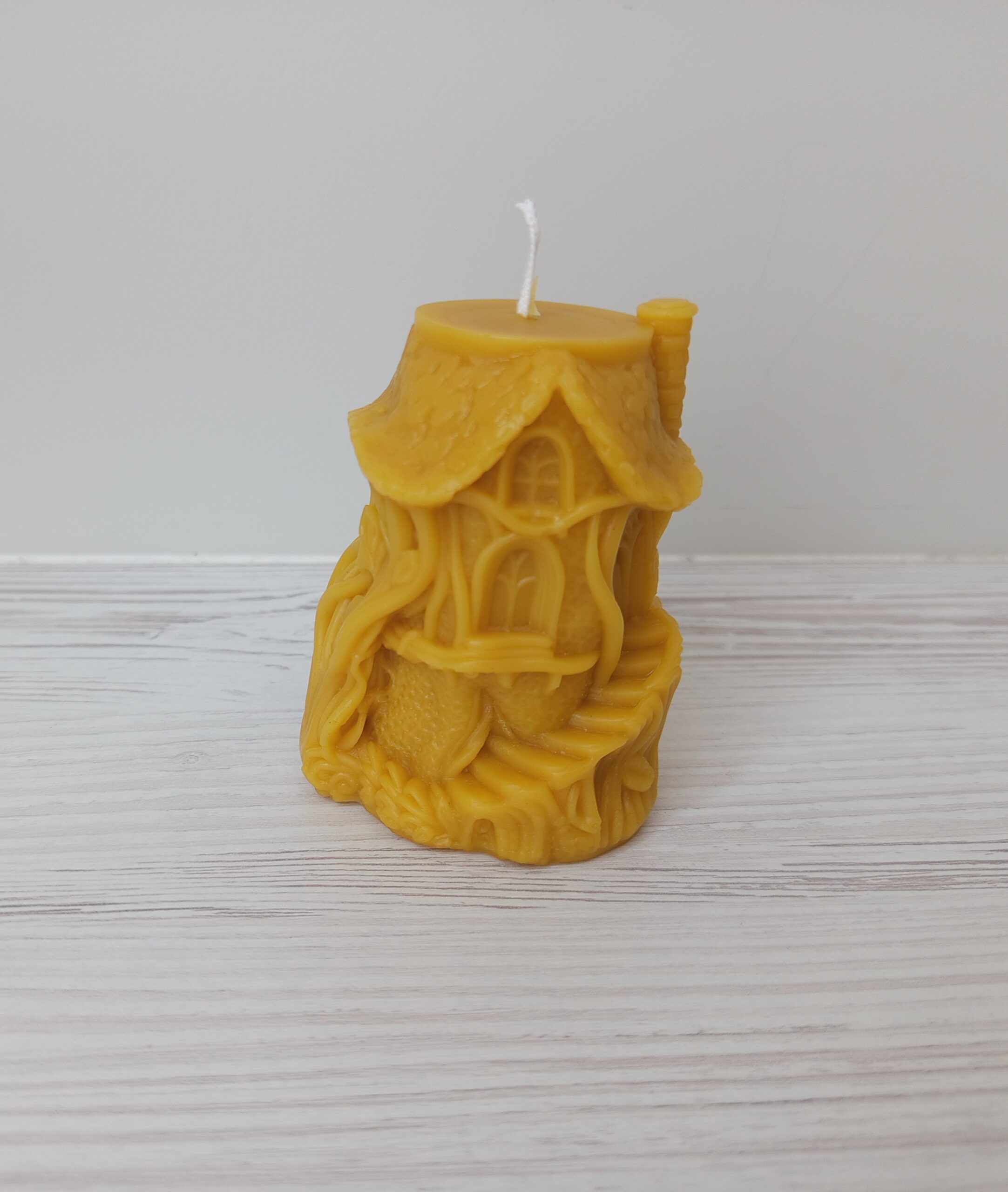 This handmade fairy house candle is crafted from 100% natural beeswax and finished with a cotton wick. The candle is hand-poured into a highly detailed silicone mold, featuring a whimsical little house with windows, roof, and organic textures inspired by nature and fairytales.