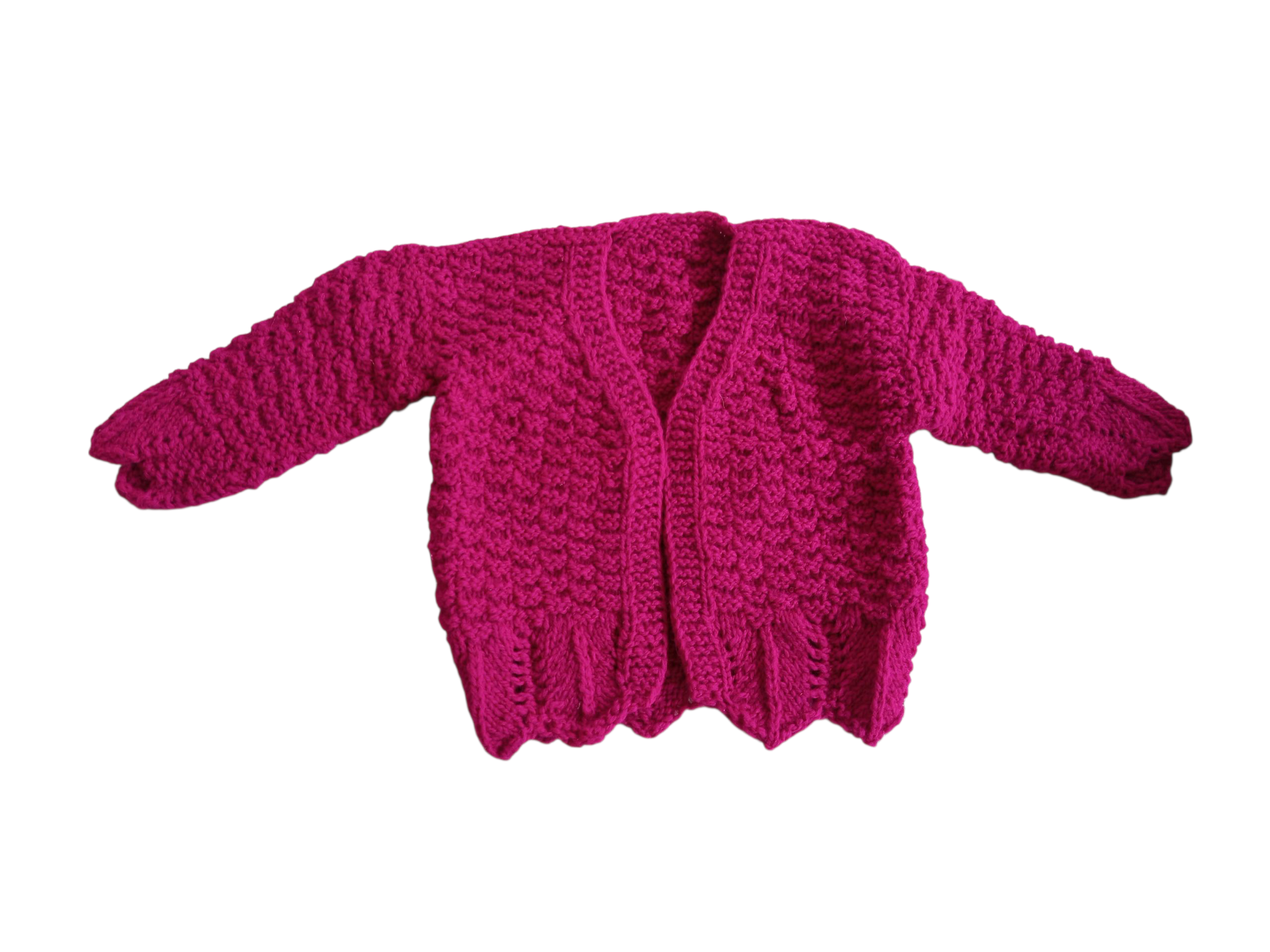 Hand-knitted baby cardigan made from a soft yarn blend containing wool. Warm, comfortable, and suitable for everyday wear during cooler seasons.