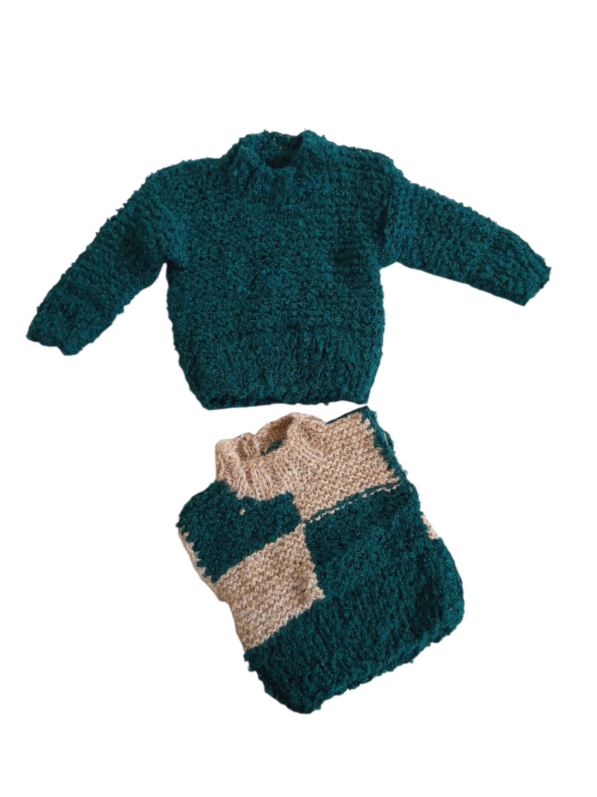 Hand-knitted baby and toddler jumper and vest made from soft, fluffy yarn. Designed to provide warmth and comfort, suitable for everyday wear during colder seasons.