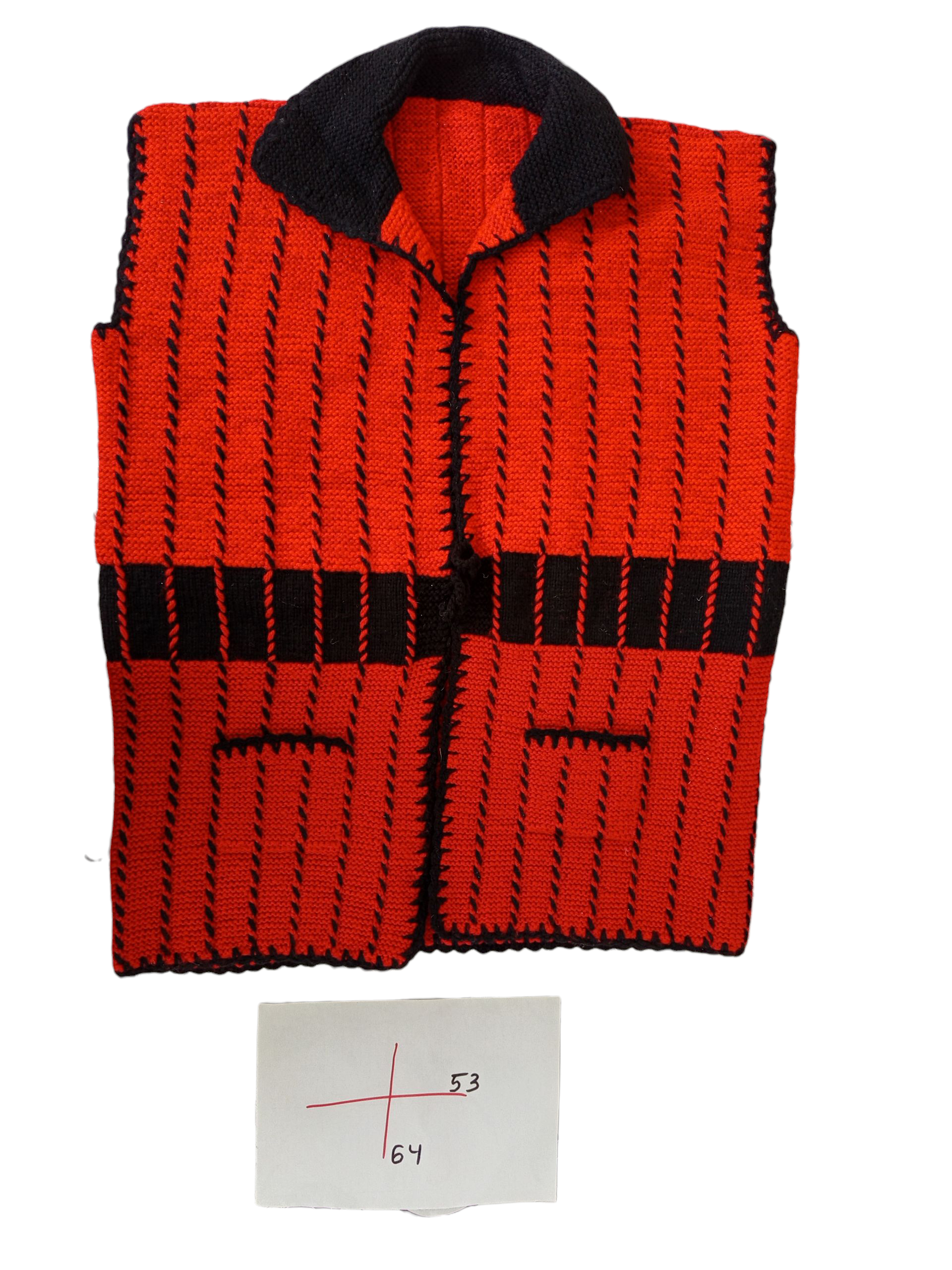 This vest stands out with its striking contrast and confident presence. Crafted from a soft yet thick yarn, it has a dense, structured knit that holds its shape beautifully while providing warmth and comfort. The bold red base is accented with black vertical details, creating a graphic, eye-catching look with strong character.
