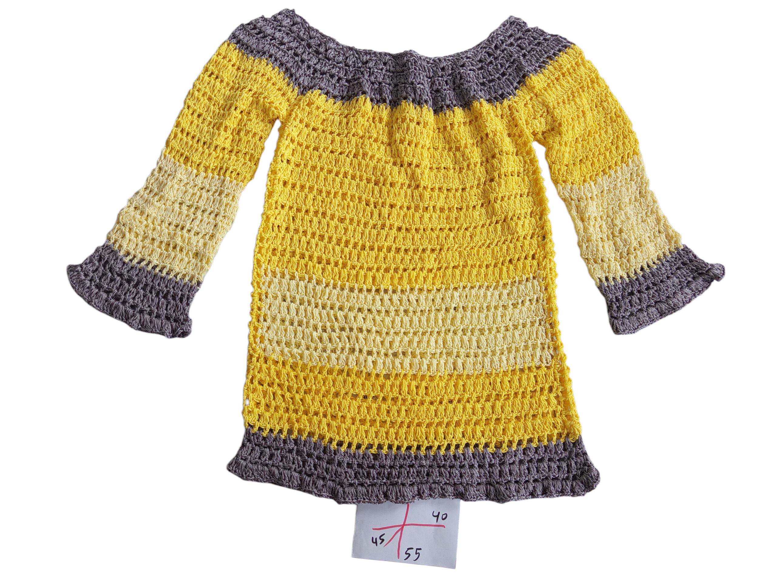 The design features horizontal color sections in yellow, cream, and gray. The neckline is wide and rounded, finished with a gray trim. The sleeves are three-quarter length, slightly flared at the cuffs, and finished with the same trim as the hem.