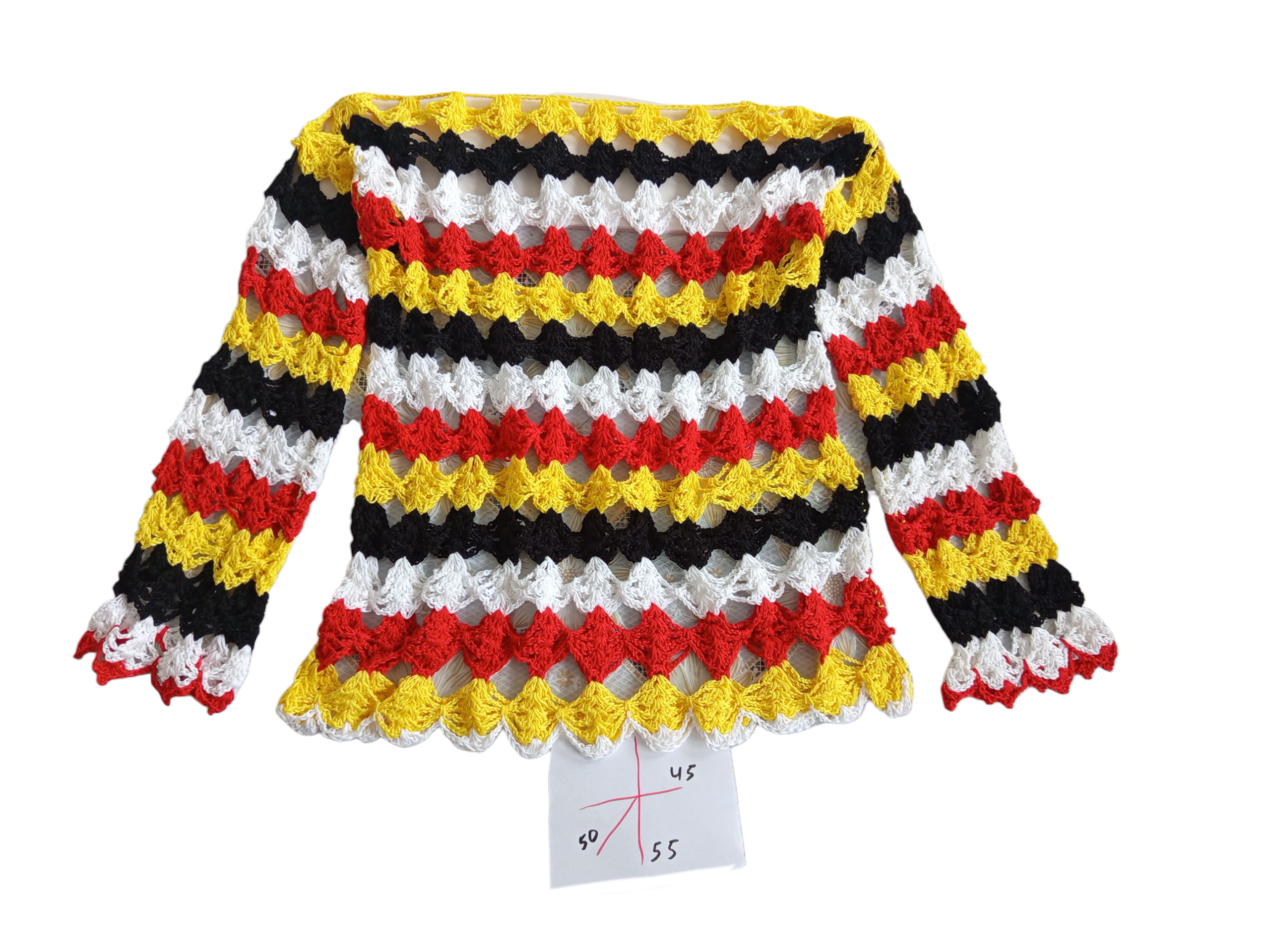 The top is worked in horizontal color stripes in yellow, red, white, and black. The pattern is consistent across the body and sleeves, giving the piece a balanced and graphic appearance. The neckline is wide and straight, and the hem and sleeves are finished with a decorative scalloped edge.