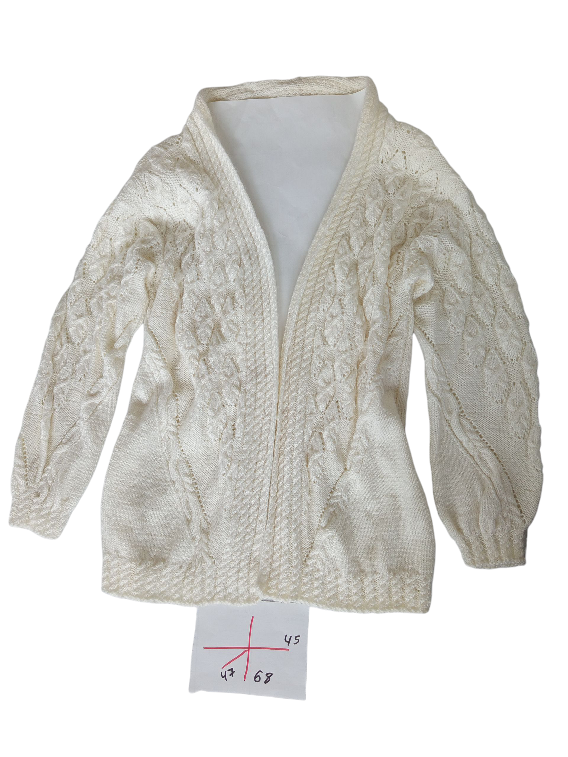 Ръчно плетен кардиган, изработен от фина, лека прежда от неестествен произход. Мек, нежен на допир и не прекалено дебел, с деликатни детайли от плетеница и елегантна текстура. Удобен и универсален, идеален за ежедневно носене и наслояване през меките сезони.