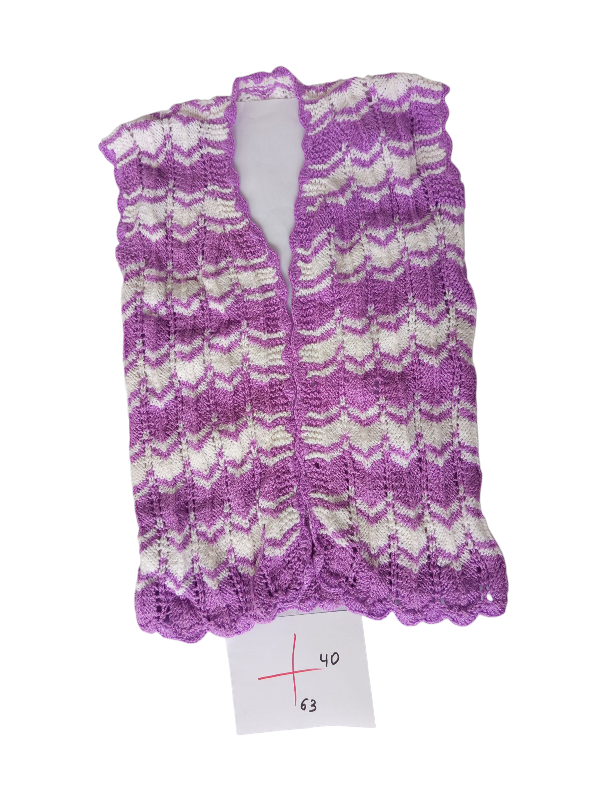 This beautifully hand-knitted vest features an elegant chevron pattern in a fresh and eye-catching purple and white color combination. The textured knit adds depth and movement, while the softly scalloped hem gives the piece a gentle, feminine finish.