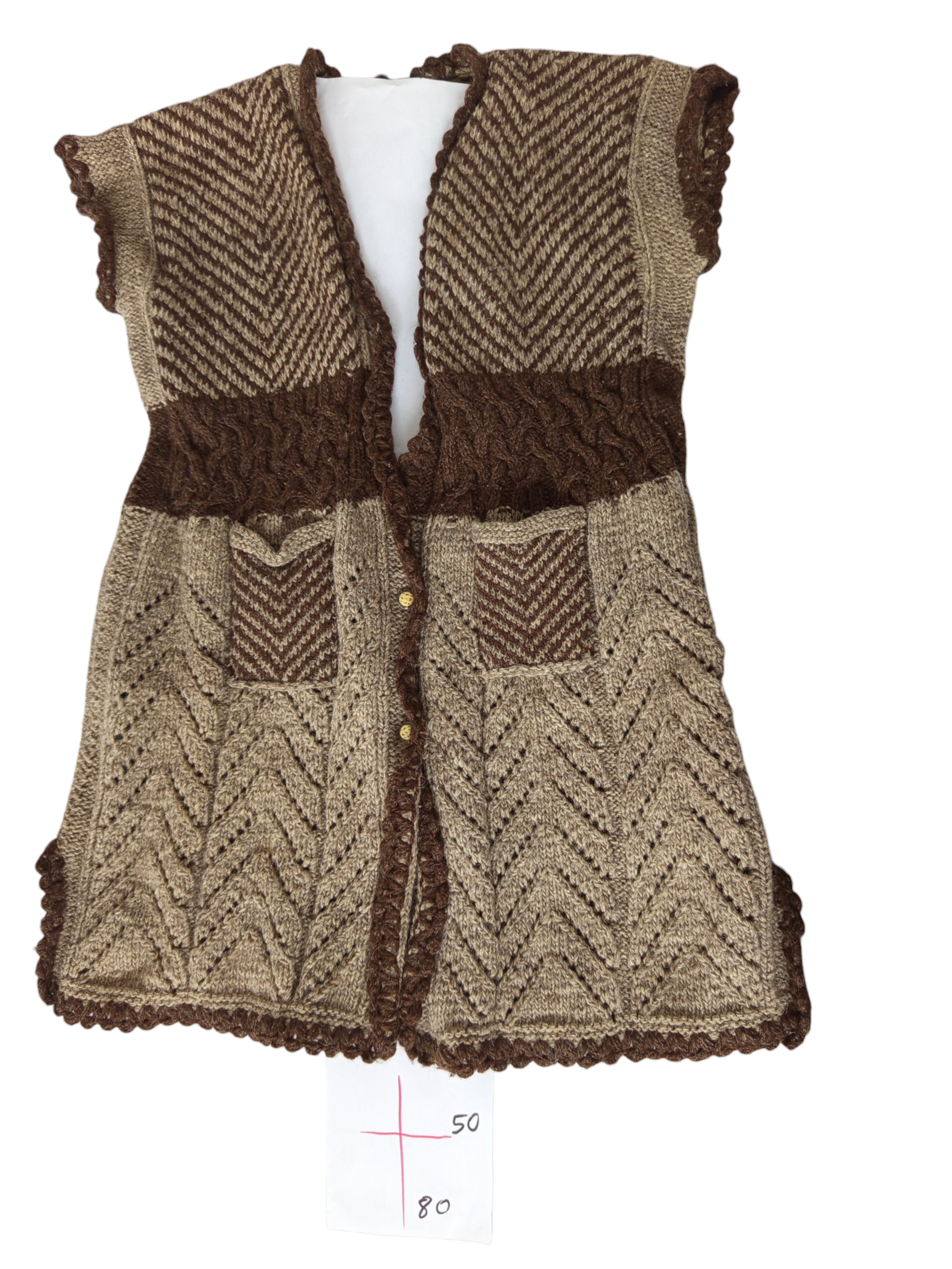 Този елек се откроява с богатата си текстура и внимателно наслоените си плетени шарки, съчетаващи здравина и мекота в красиво балансиран дизайн. Взаимодействието на топли кафяви и естествени бежови тонове създава дълбочина и контраст, придавайки на изделието земна елегантност.