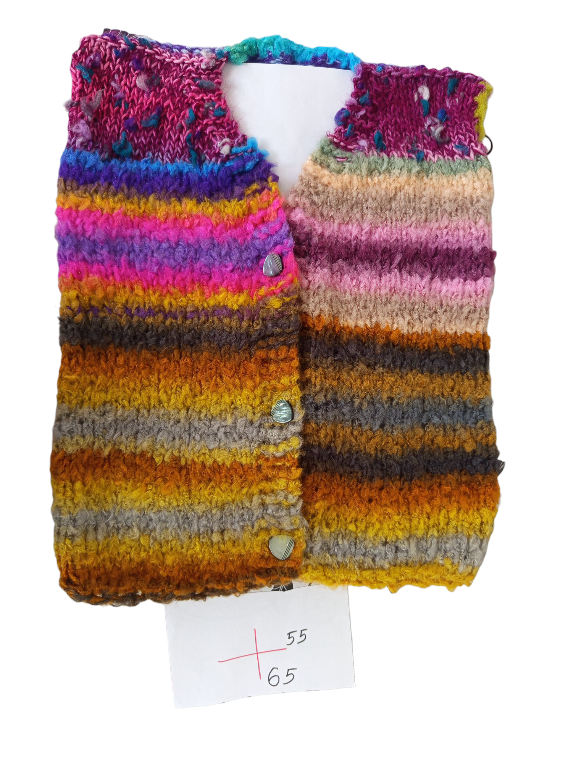 This vest is a true statement piece—bold, expressive, and full of character. Knitted from an effect yarn blend, it features rich color transitions and a beautifully textured surface that immediately draws the eye. The multicolor stripes create depth and movement, giving the garment an artistic yet wearable presence.