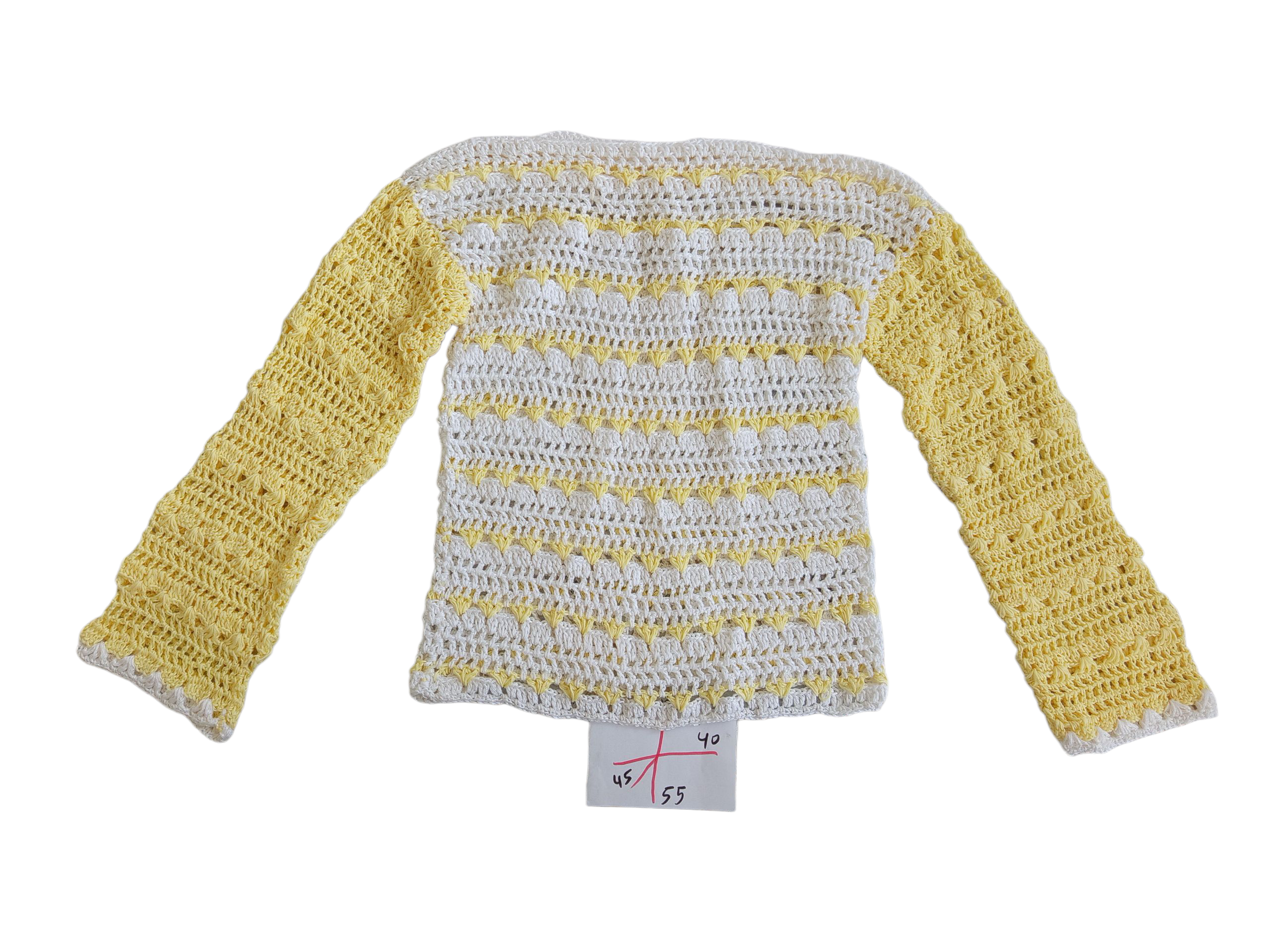 The body of the blouse is worked in soft white with subtle yellow accents woven into the stitch pattern, creating a refined, rhythmic texture. The sleeves are fully crocheted in warm yellow, adding contrast and giving the piece a calm but distinctive visual identity. The stitch work is even and airy, offering flexibility and a relaxed drape.